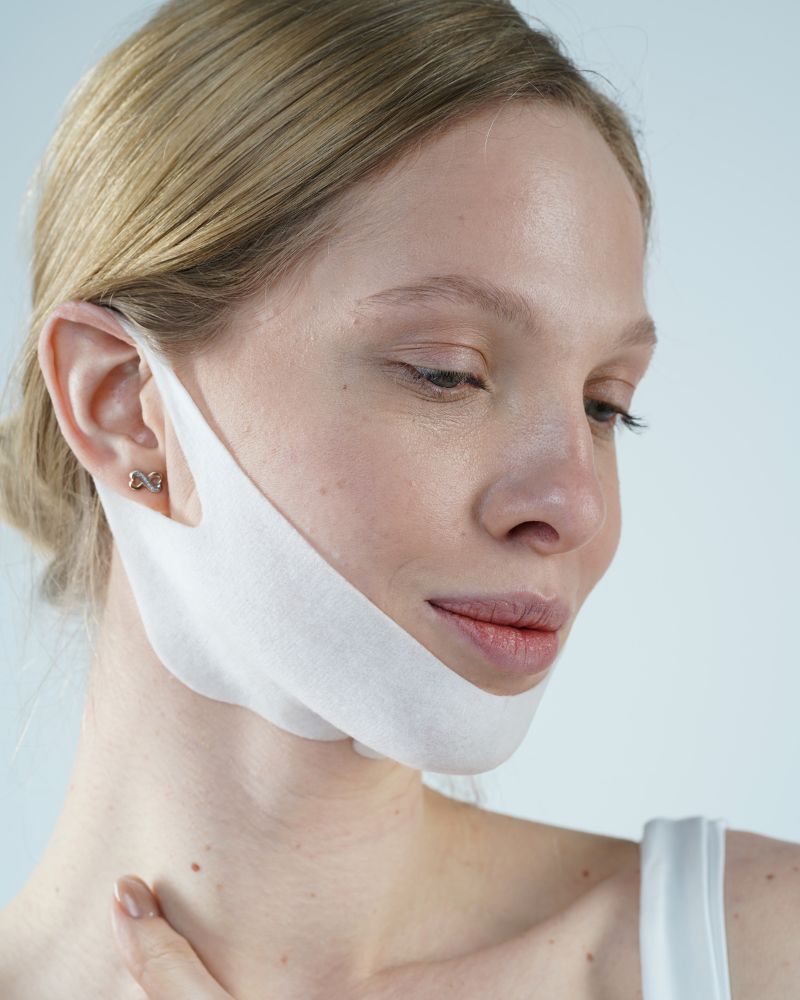 Our lifting hydrogel mask contains Seaweed Extract which promote collagen production and plump skin, therefore — compress and define the jawline and help to improve the appearance of double chin. Vitamin E allows for long-lasting moisture retention.